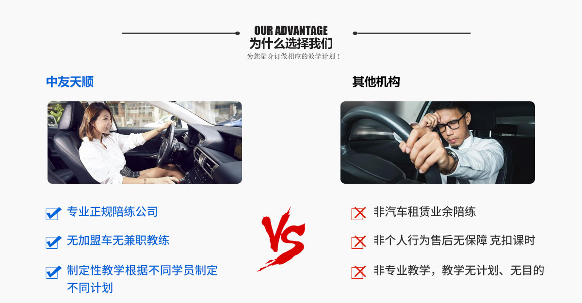 北京中友天順汽車陪練隸屬于北京中友天順汽車技術有限公司一家專業的汽車陪練公司,公司秉承宗旨:為已有駕駛本而不能夠在實際道路上安全行駛的駕駛員而服務的,我們大力宣揚道路安全駕駛理念,深度提高駕駛員駕駛技術,為首都駕駛員的安全駕駛技術和安全駕駛意識服務.從而減少首都道路的涌堵,減少首都交通事故的發生。針對不同開車基礎的學員制定各種培訓方案!誠信、專業、周到!北京中友天順汽車陪練公司全部為部隊轉業軍人,駕齡都在十五年以上, 曾在部隊任職教練工作多年,又經專業培訓上崗,教學多年,經驗豐富,耐心細致,服務規范!針對不同程度的學員駕駛技術特設培訓班,保證能使每個練車學員在最短的時間內學到真正的駕駛技能,能夠安全獨立駕駛車輛。  另針對膽小緊張、技術偏差、多年不動車零基礎學員,特設技術培訓班!